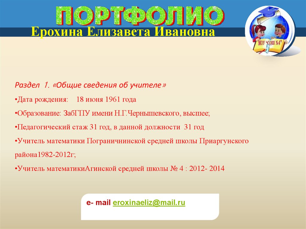 Портфолио Учителя МОУ «Агинская средняя общеобразовательная школа №4» Ерохиной Елизаветы Ивановны