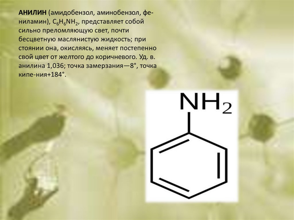 АНИЛИН (амидобензол, аминобензол, фениламин), C6H6NH2, представляет собойсильно преломляющую свет, почти