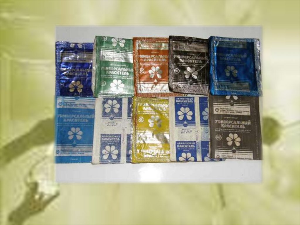 образцы синтетических красителей и окрашенные ими ткани, перья и меха.