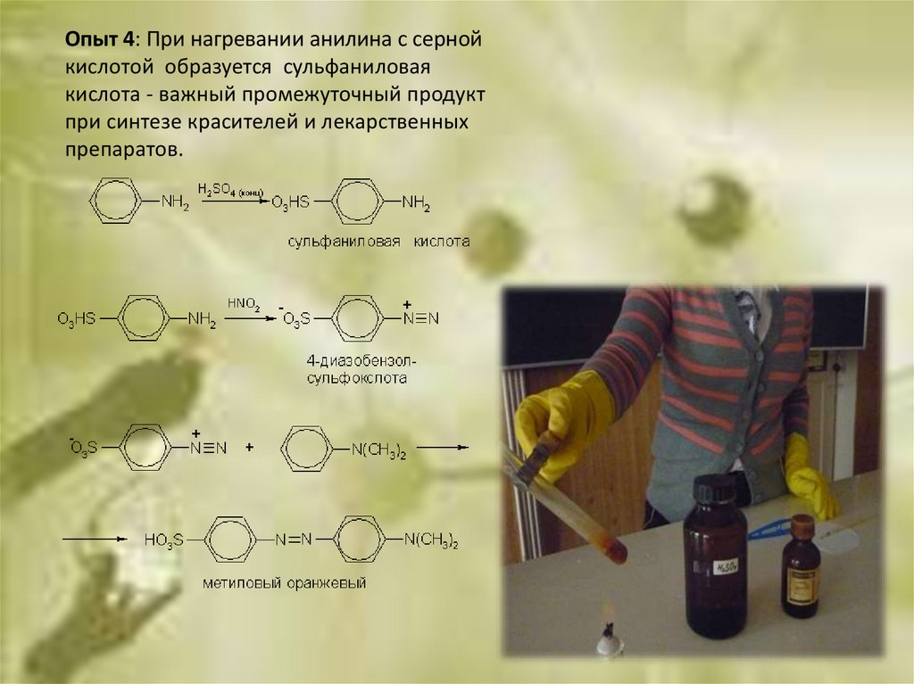 Опыт 4: При нагревании анилина с сернойкислотой образуется сульфаниловая