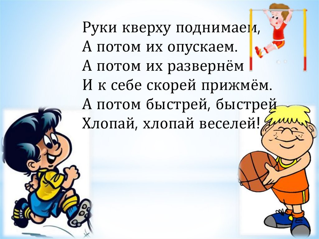 Руки кверху поднимаем,А потом их опускаем.
