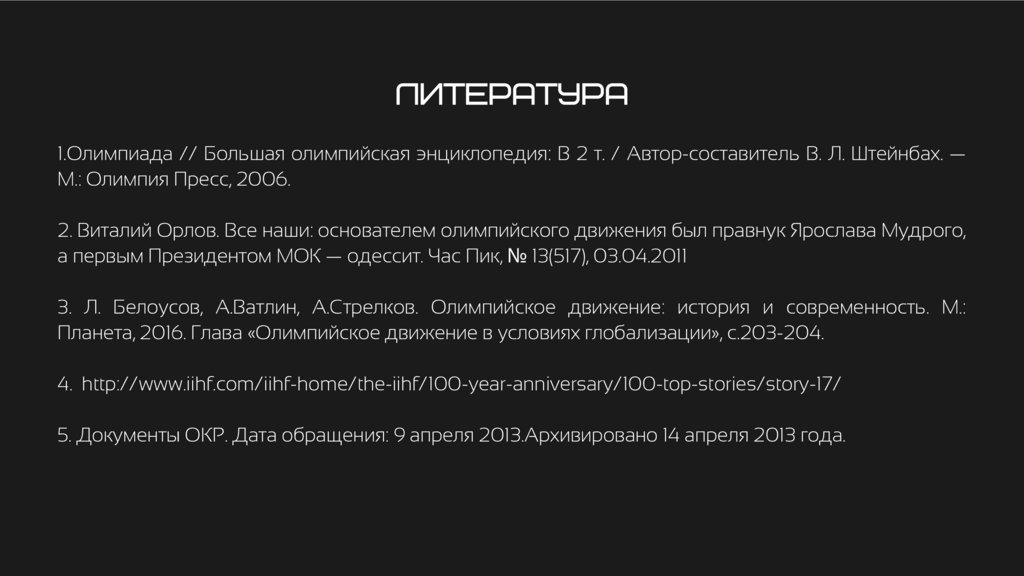 Литература1.Олимпиада // Большая олимпийская энциклопедия: В 2 т. / Автор-составитель В. Л. Штейнбах. —