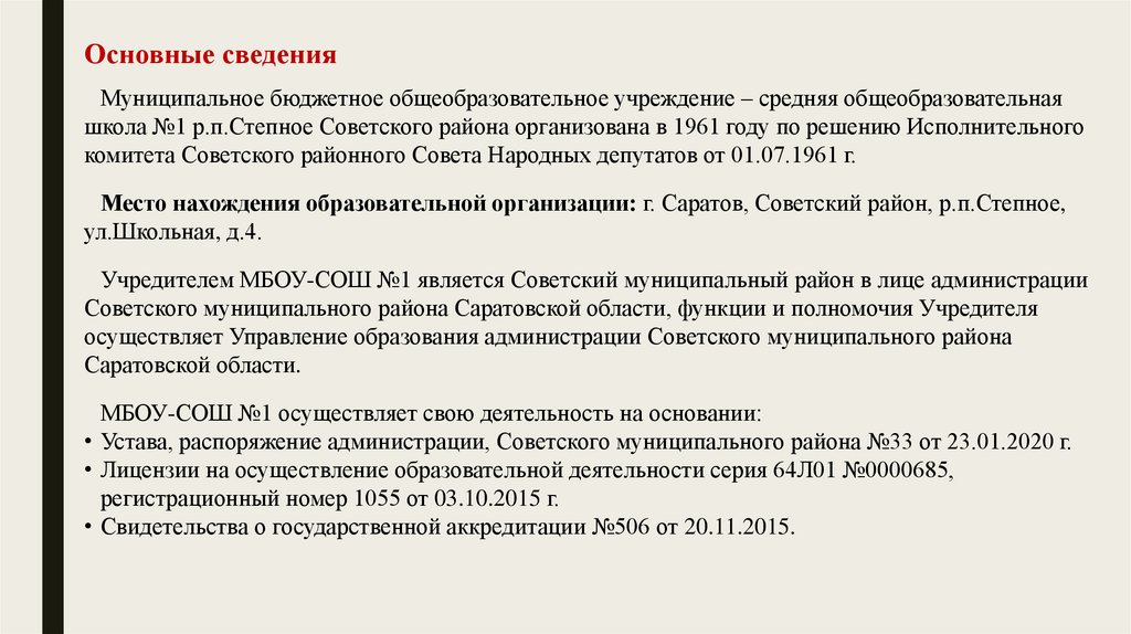 Основные сведенияМуниципальное бюджетное общеобразовательное учреждение – средняя общеобразовательная