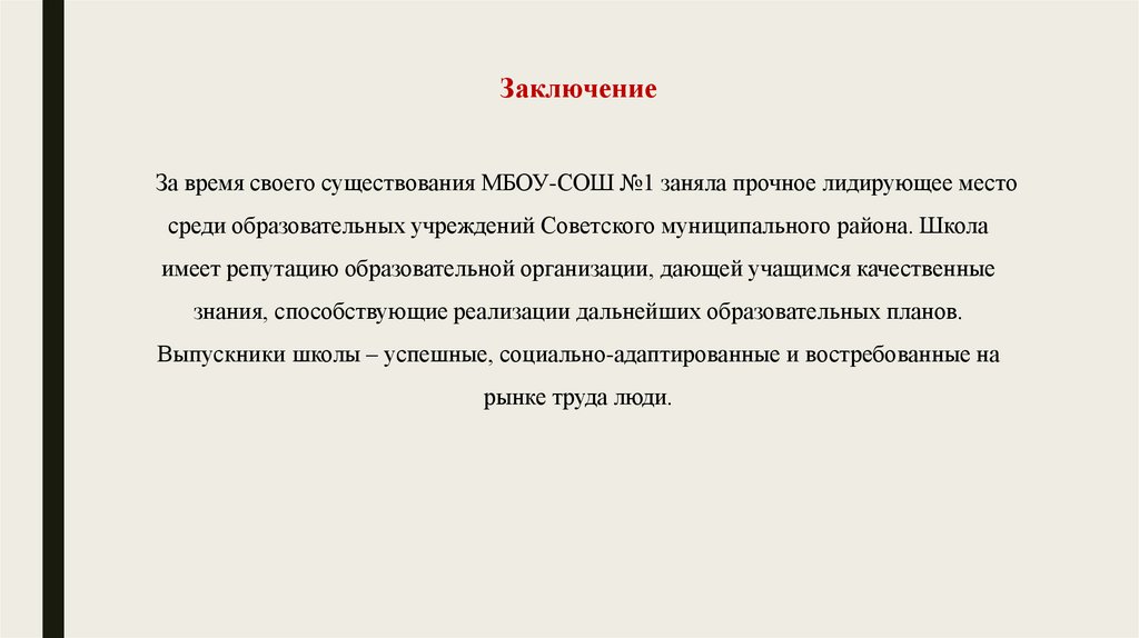 ЗаключениеЗа время своего существования МБОУ-СОШ №1 заняла прочное лидирующее место
