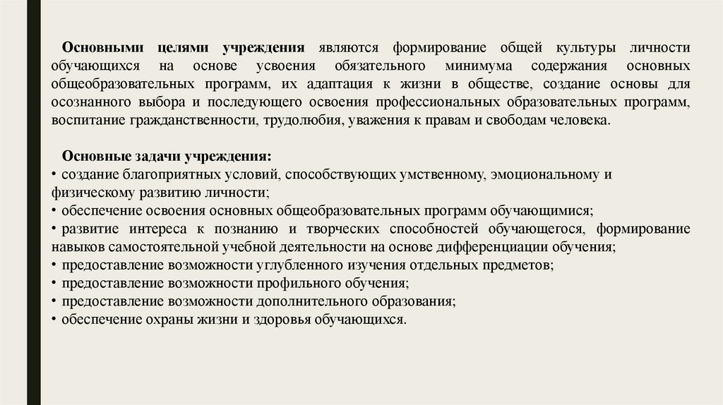 Основными целями учреждения являются формирование общей культуры личностиобучающихся на основе усвоения обязательного минимума содержания основных