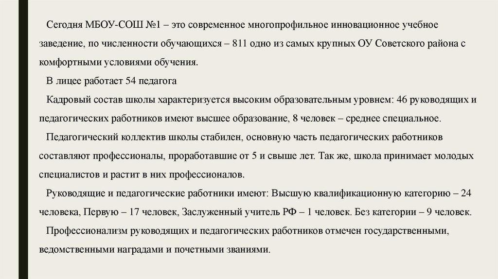 Сегодня МБОУ-СОШ №1 – это современное многопрофильное инновационное учебноезаведение, по численности обучающихся – 811 одно из самых крупных ОУ Советского района с