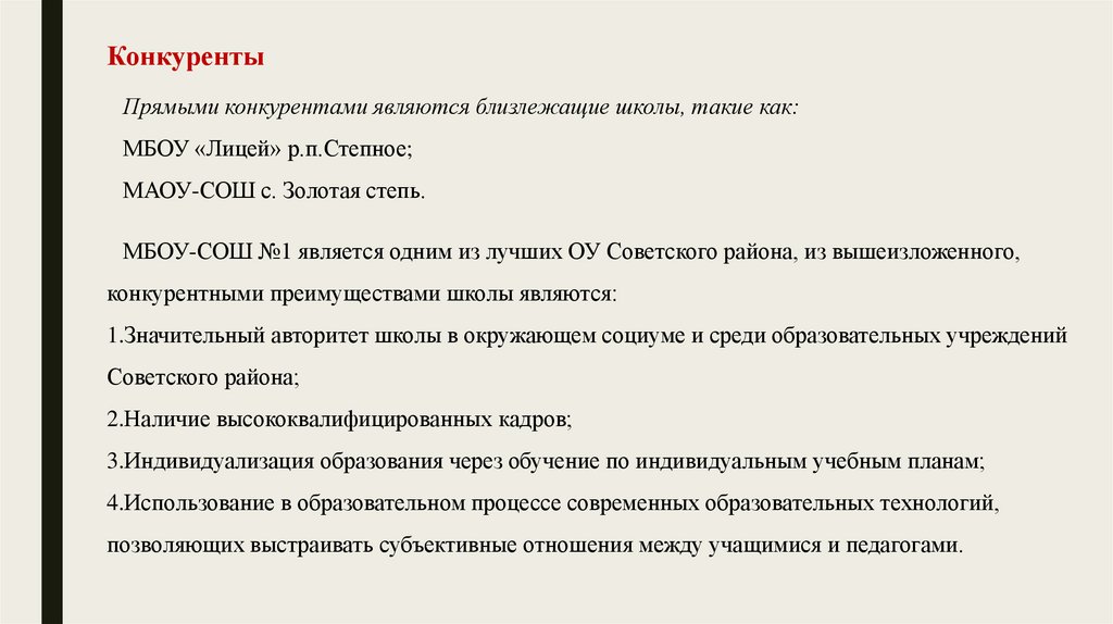 КонкурентыПрямыми конкурентами являются близлежащие школы, такие как: