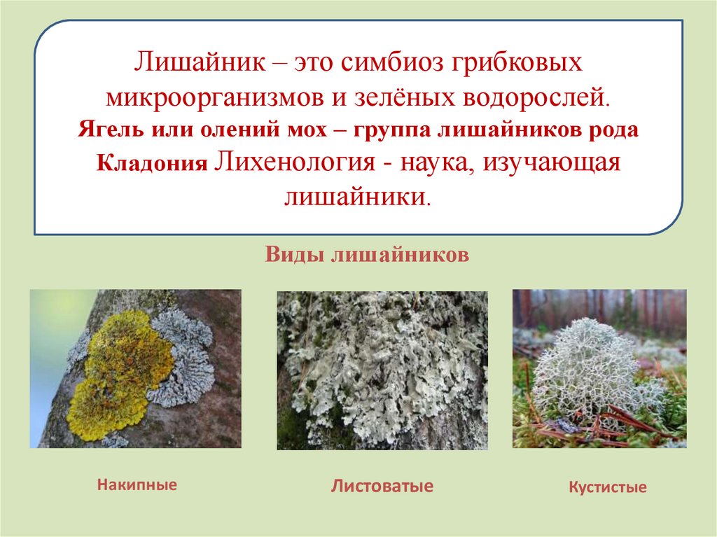 Лишайник – это симбиоз грибковыхмикроорганизмов и зелёных водорослей.