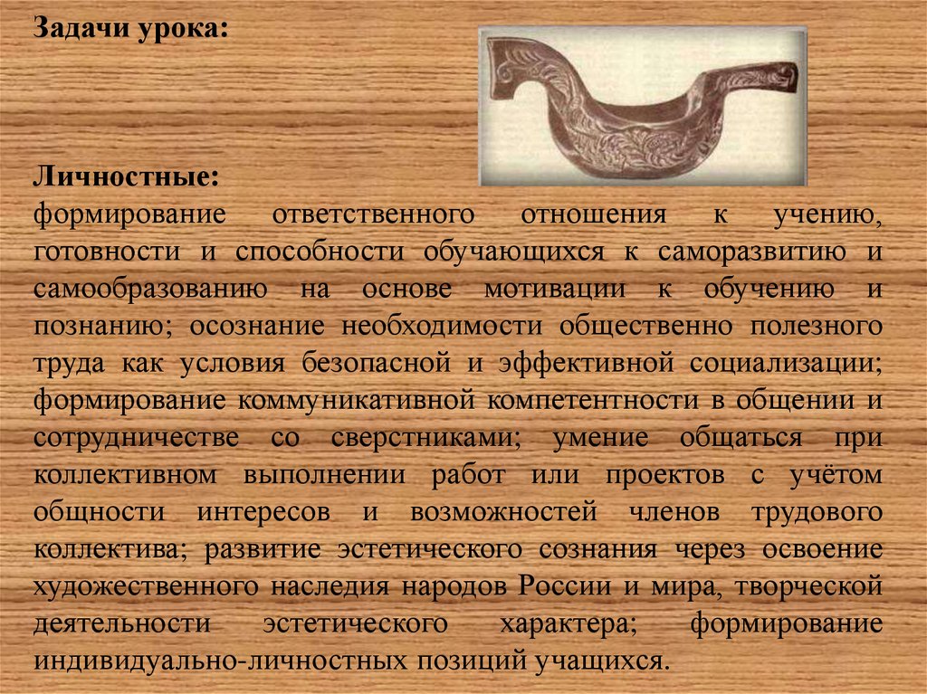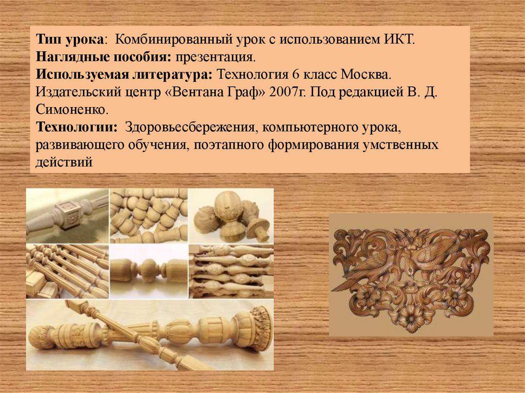 Цель урока: познакомить учащихся со способами художественнойобработки древесины (резьбой по дереву); совершенствовать
