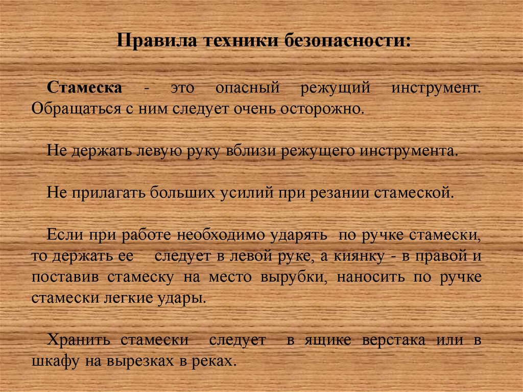 Правила техники безопасности:Стамеска - это опасный режущий