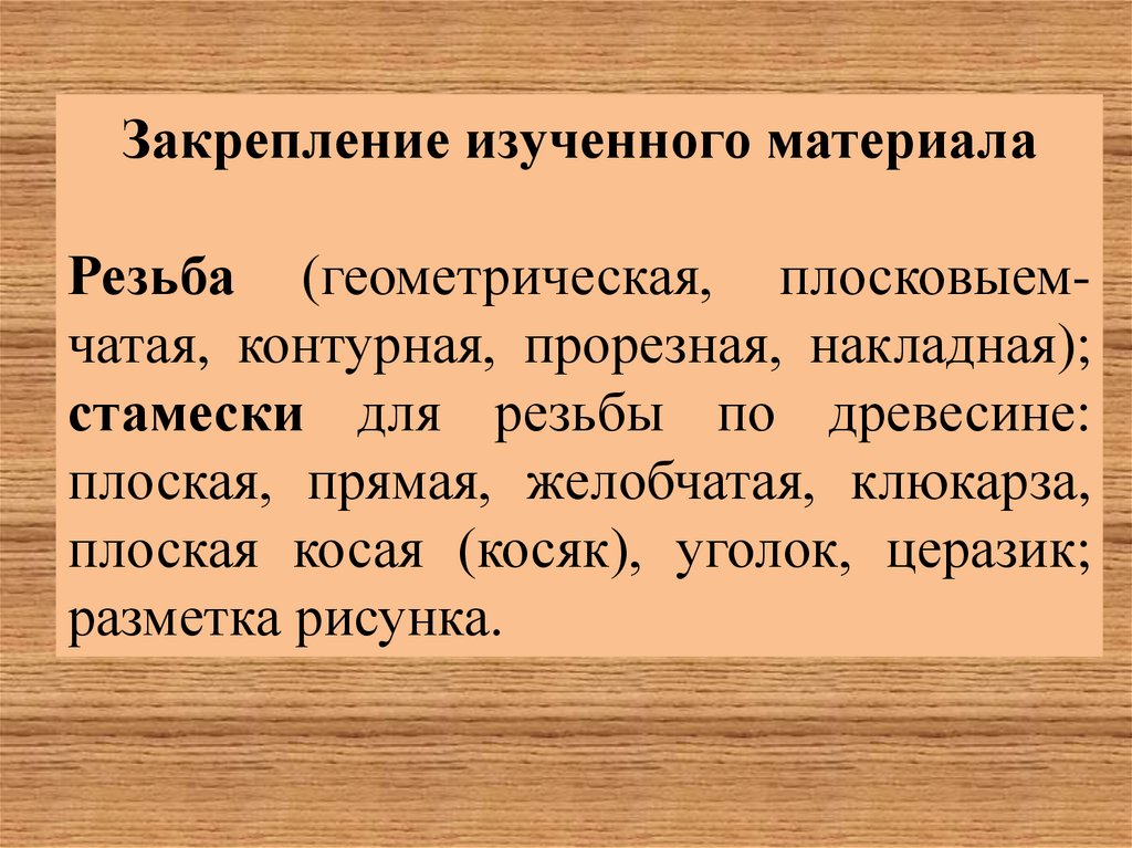 Закрепление изученного материалаРезьба (геометрическая, плосковыемчатая, контурная, прорезная, накладная);