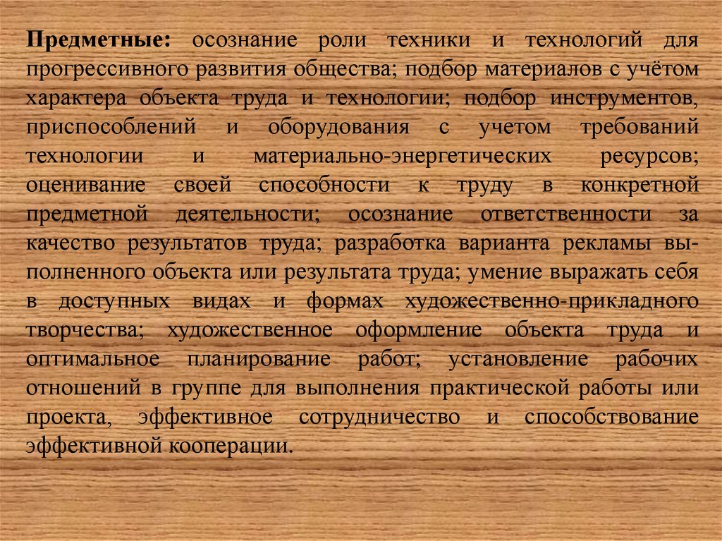 Предметные: осознание роли техники и технологий дляпрогрессивного развития общества; подбор материалов с учётом