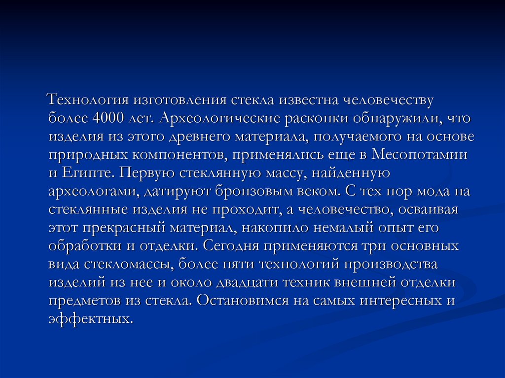 Технология изготовления стекла известна человечествуболее 4000 лет. Археологические раскопки обнаружили, что