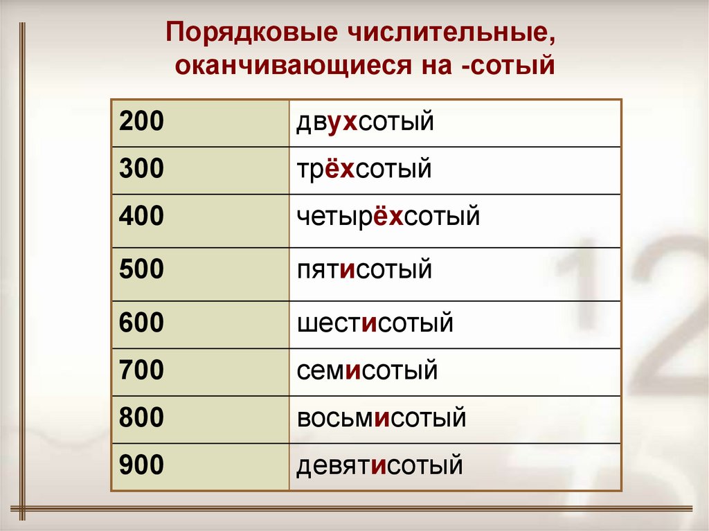 Порядковые числительные,оканчивающиеся на -сотый