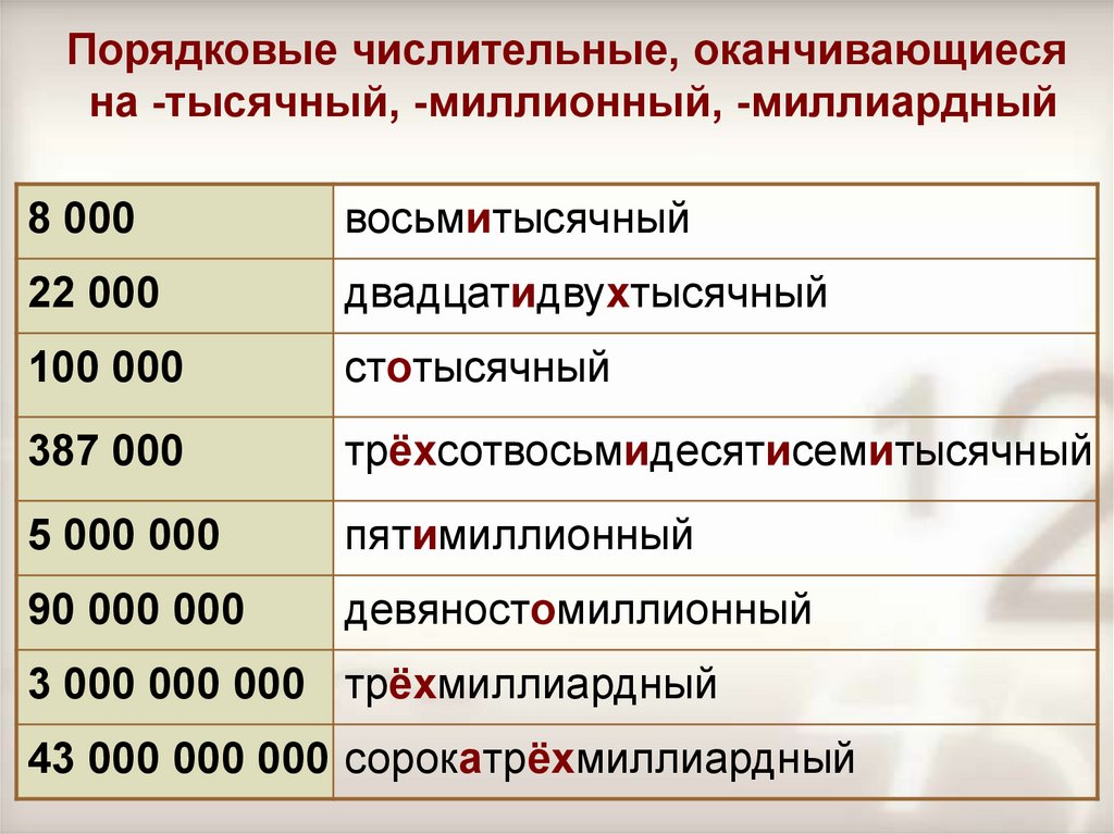 Порядковые числительные, оканчивающиесяна -тысячный, -миллионный, -миллиардный