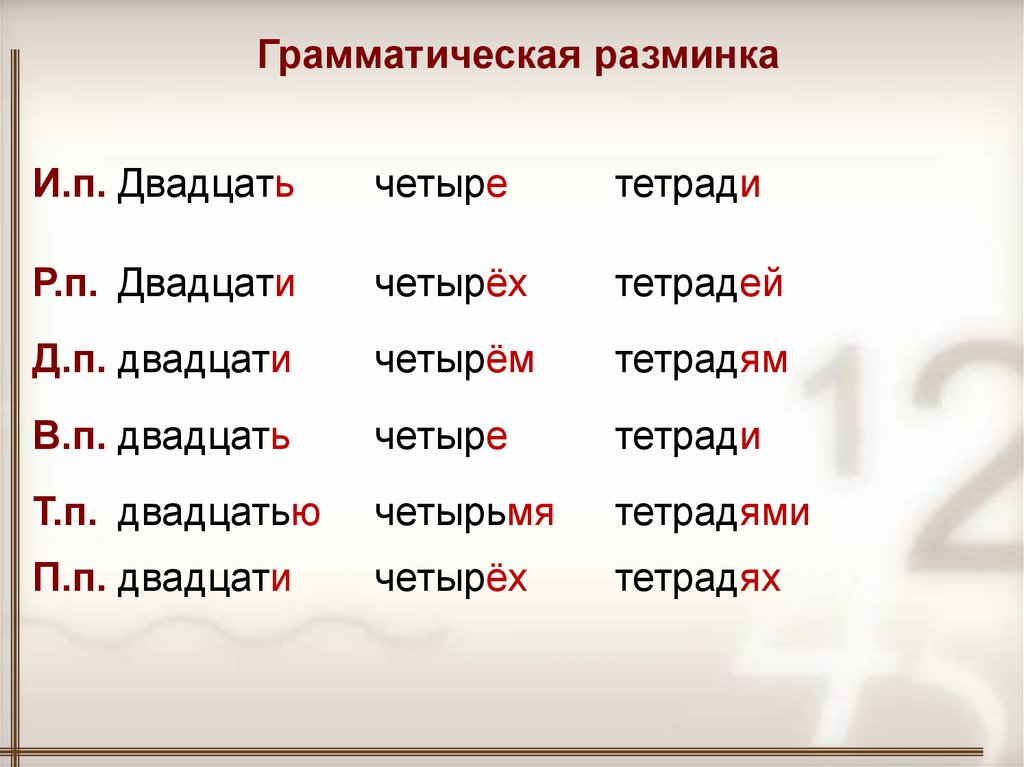 Грамматическая разминкаИ.п. Двадцать