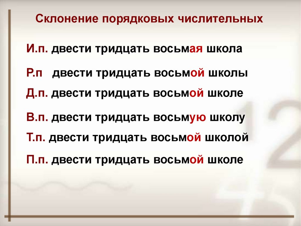 Склонение порядковых числительныхИ.п. двести тридцать восьмая школа