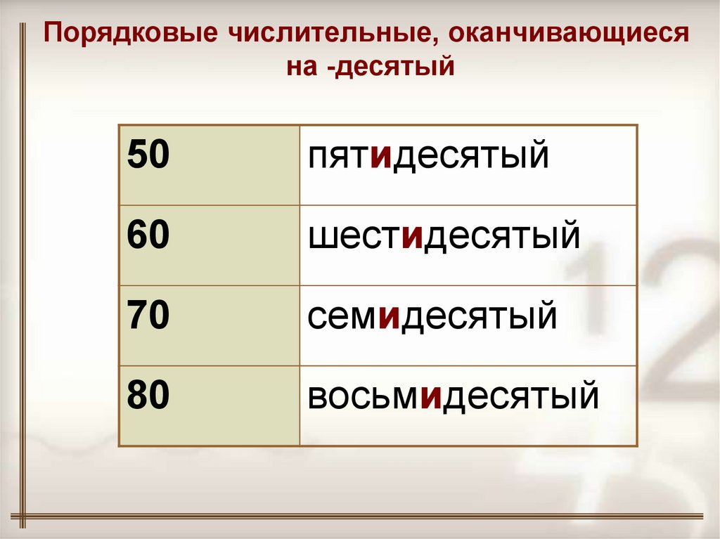 Порядковые числительные, оканчивающиесяна -десятый