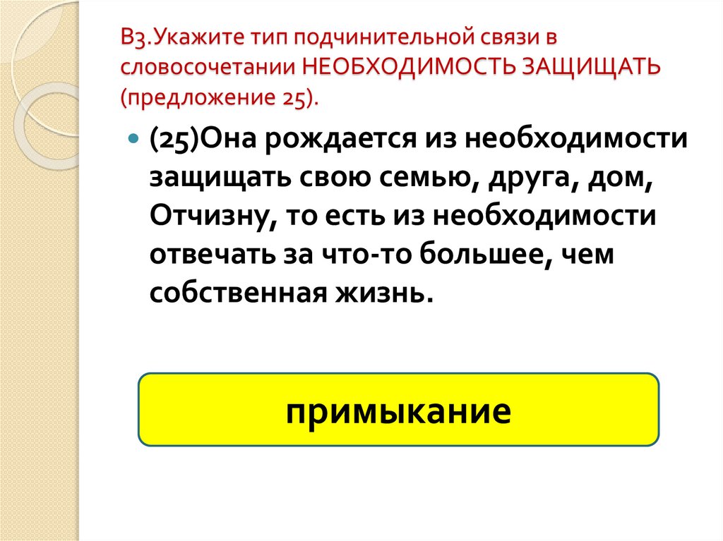 В3.Укажите тип подчинительной связи всловосочетании НЕОБХОДИМОСТЬ ЗАЩИЩАТЬ