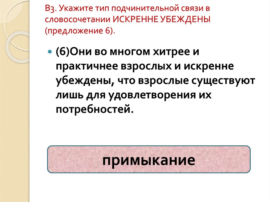 В3. Укажите тип подчинительной связи всловосочетании ИСКРЕННЕ УБЕЖДЕНЫ