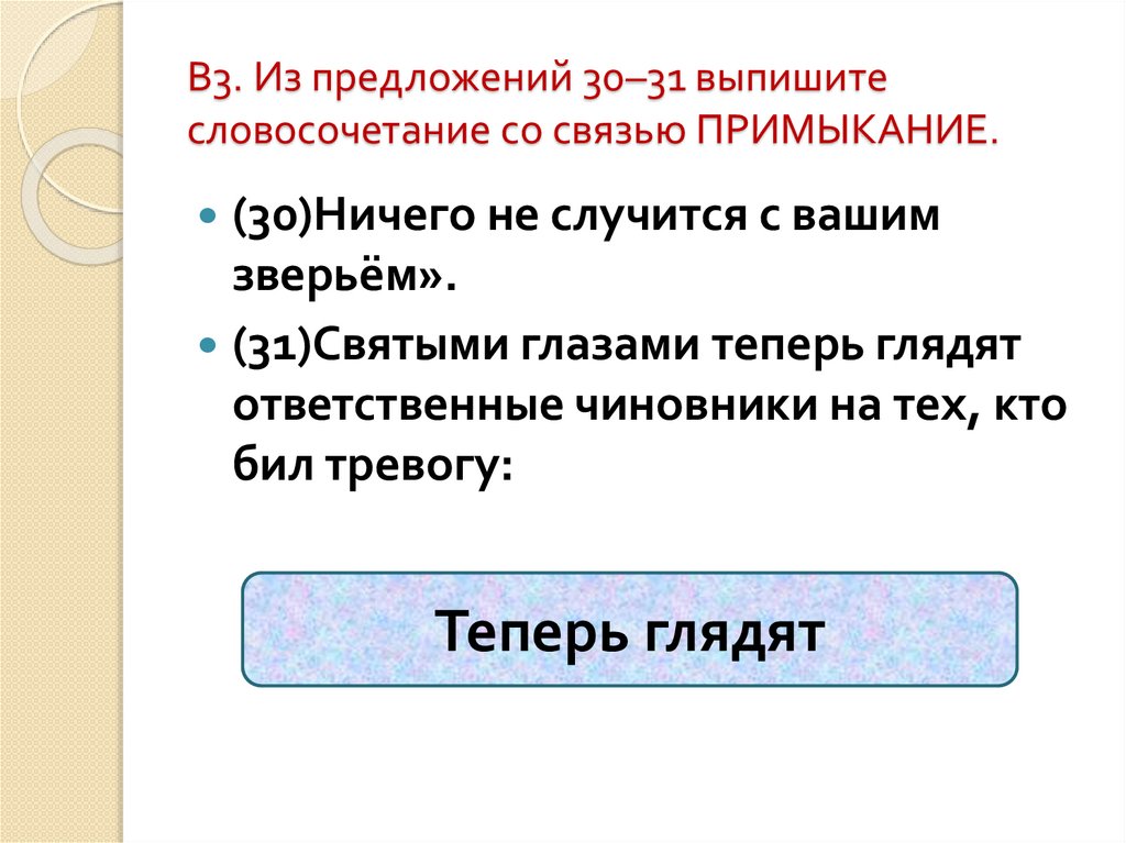 В3. Из предложений 30–31 выпишитесловосочетание со связью ПРИМЫКАНИЕ.