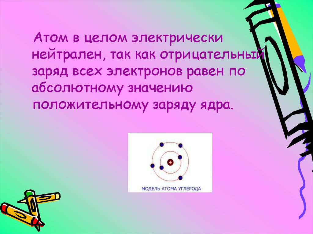 Атом в целом электрическинейтрален, так как отрицательный