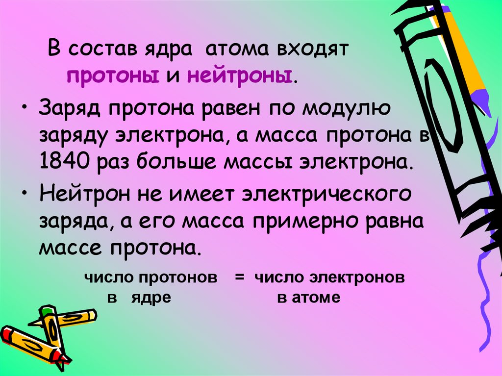 В состав ядра атома входятпротоны и нейтроны.