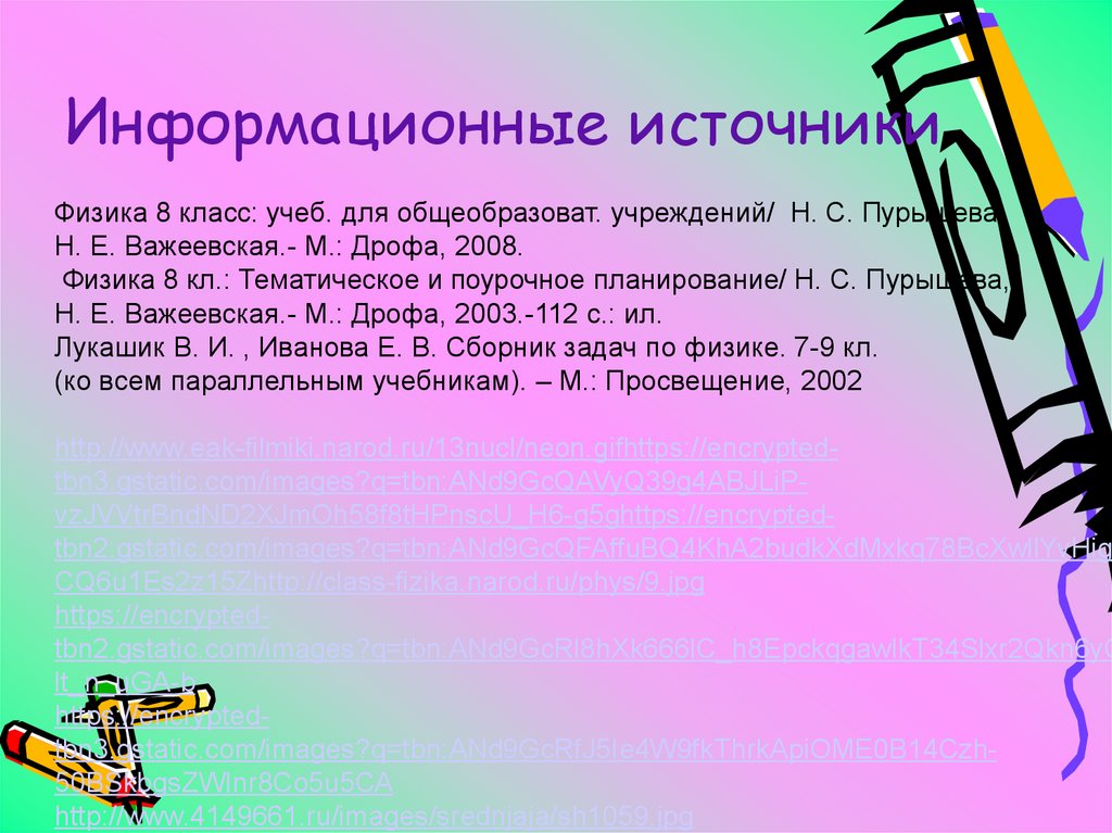 Информационные источникиФизика 8 класс: учеб. для общеобразоват. учреждений/ Н. С. Пурышева,