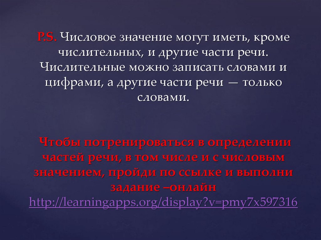 P.S. Числовое значение могут иметь, кромечислительных, и другие части речи.