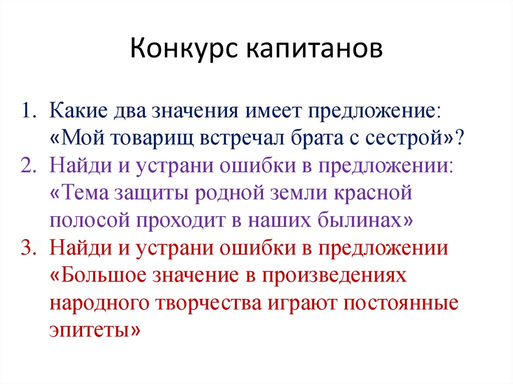 Конкурс капитанов1. Какие два значения имеет предложение: