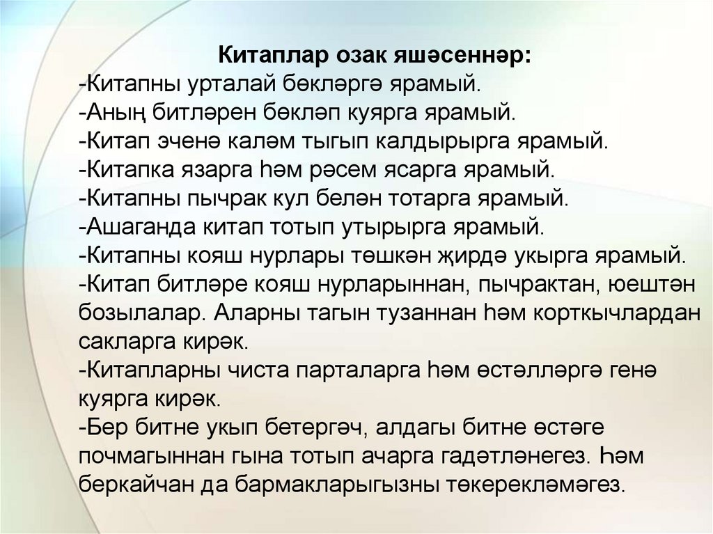 Китаплар озак яшәсеннәр:-Китапны урталай бөкләргә ярамый.