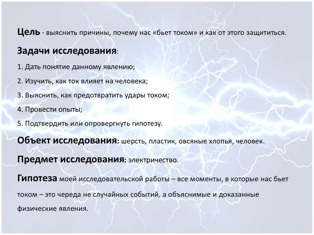Цель - выяснить причины, почему нас «бьет током» и как от этого защититься.Задачи исследования: