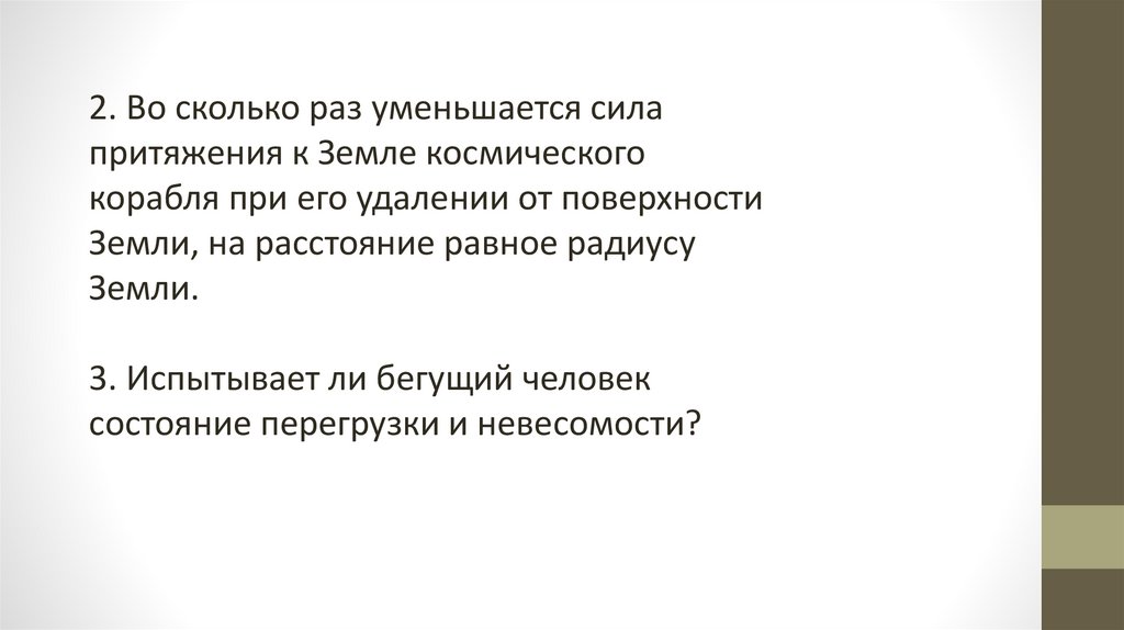 2. Во сколько раз уменьшается силапритяжения к Земле космического