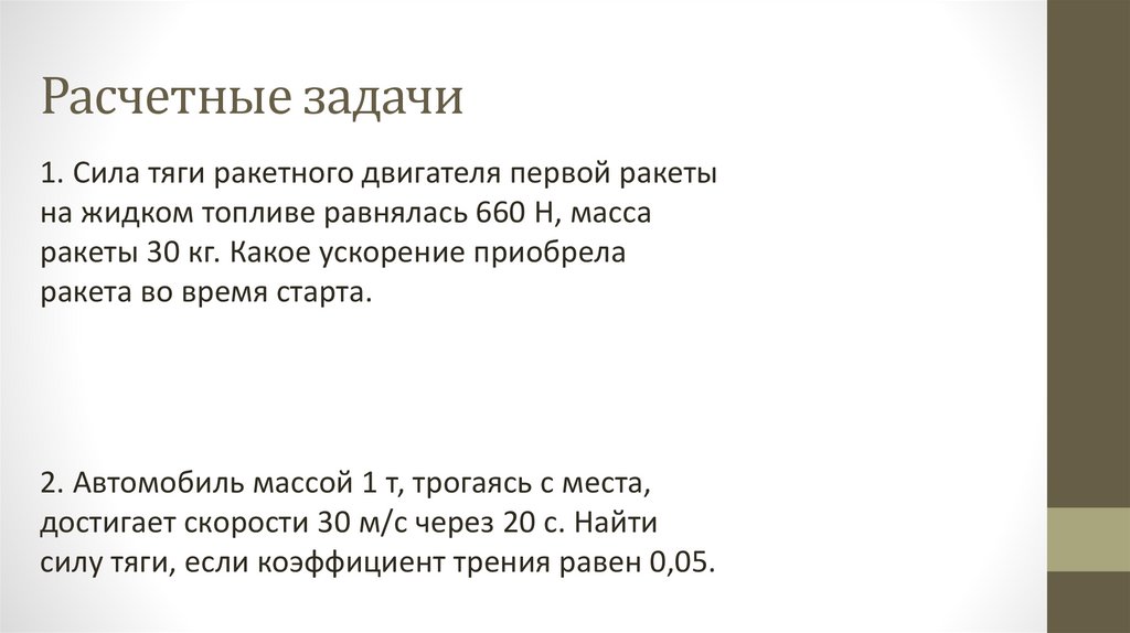 Расчетные задачи1. Сила тяги ракетного двигателя первой ракеты