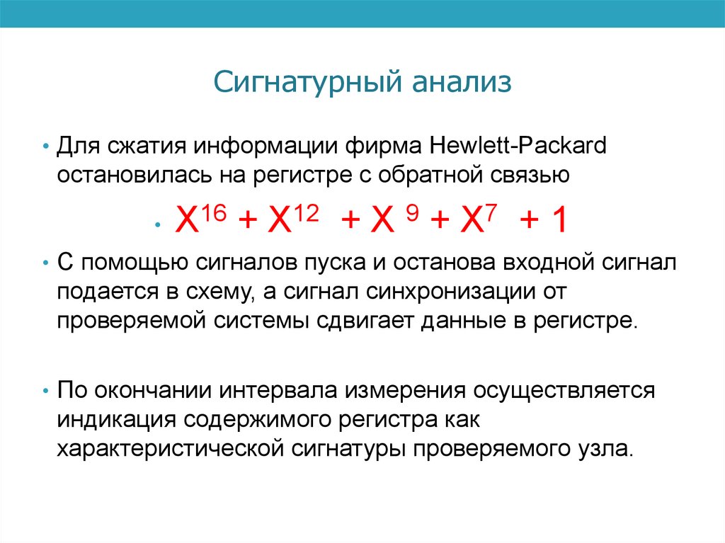 Сигнатурный анализ• Для сжатия информации фирма Hewlett-Packard