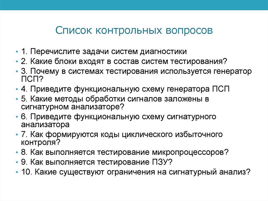 Список контрольных вопросов• 1. Перечислите задачи систем диагностики