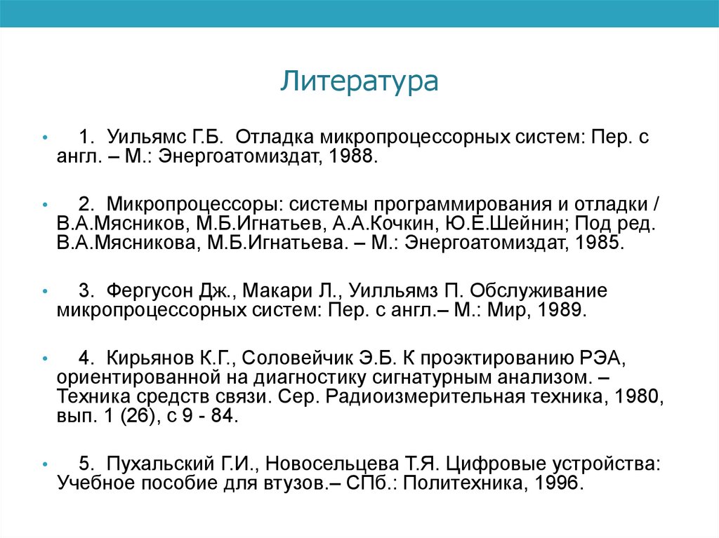 Литература1. Уильямс Г.Б. Отладка микропроцессорных систем: Пер. с