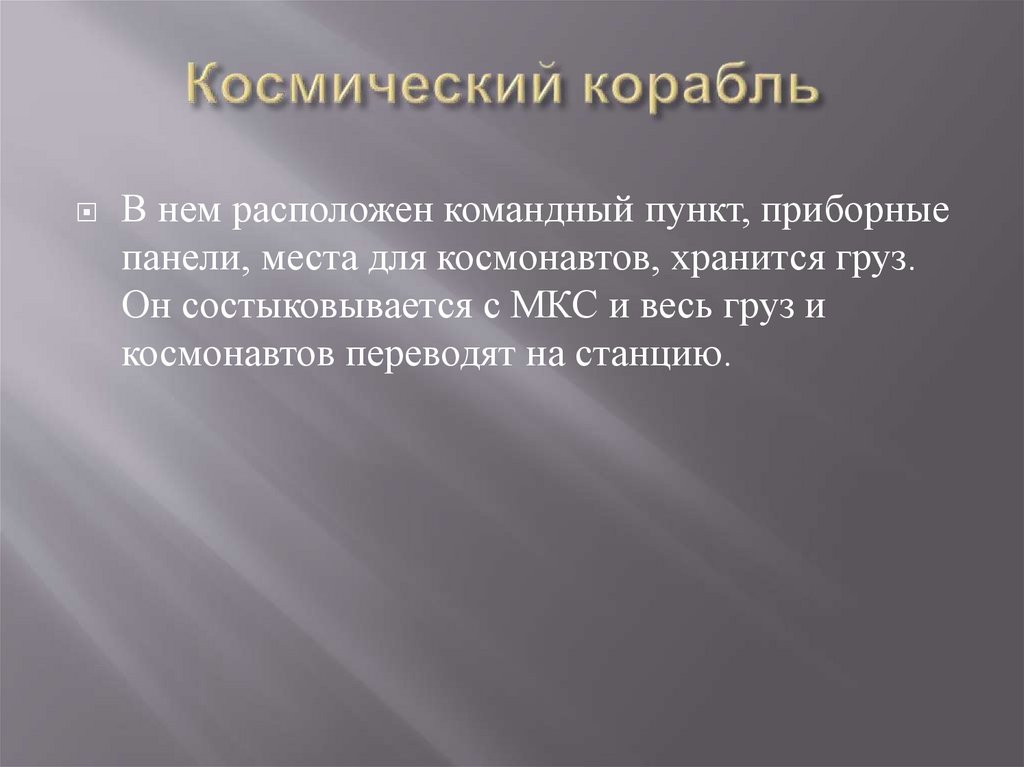 В нем расположен командный пункт, приборныепанели, места для космонавтов, хранится груз.