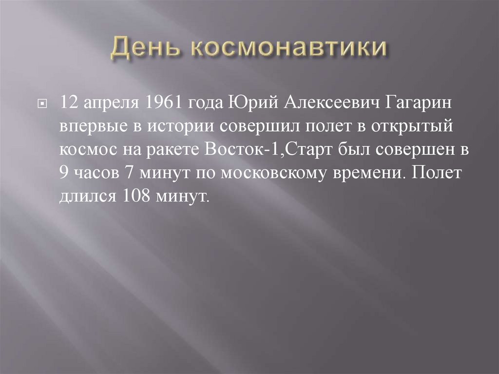 12 апреля 1961 года Юрий Алексеевич Гагаринвпервые в истории совершил полет в открытый