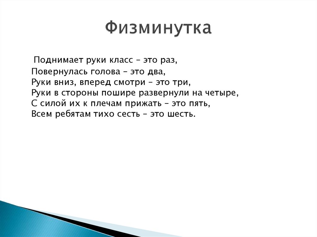Поднимает руки класс – это раз,Повернулась голова – это два,