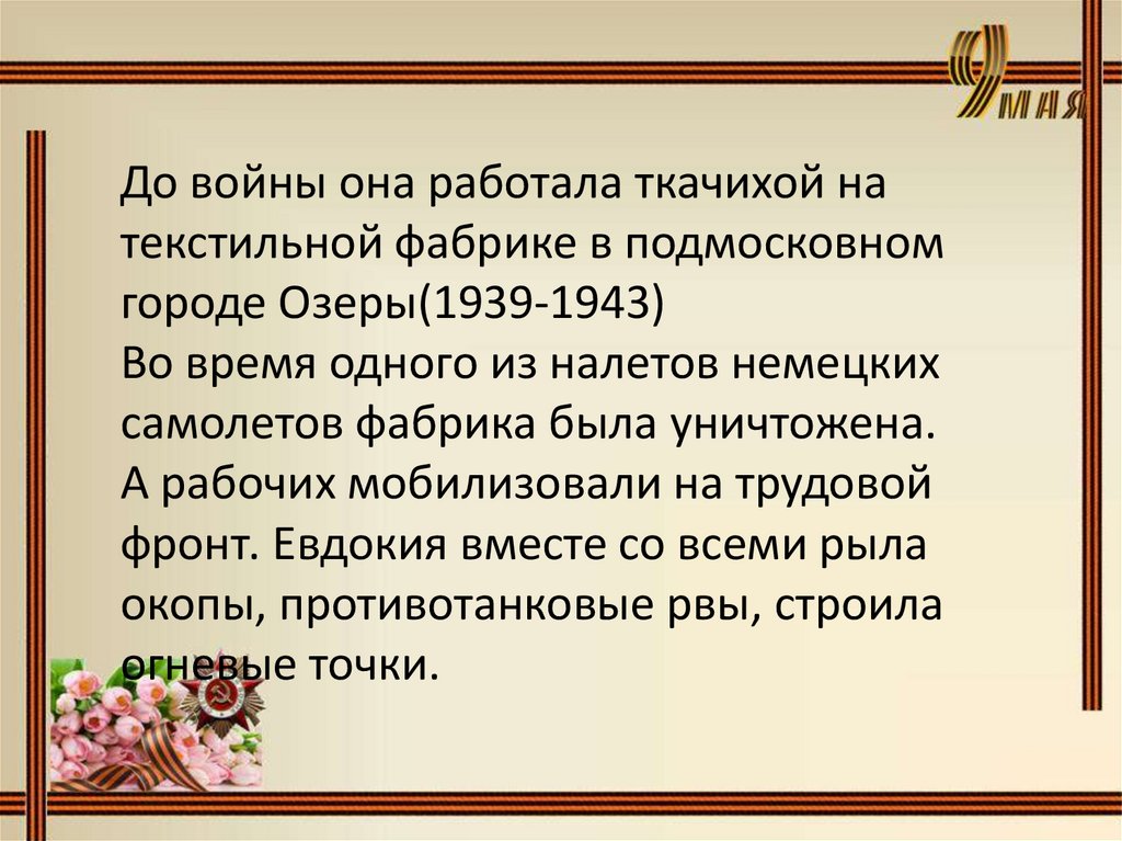 До войны она работала ткачихой натекстильной фабрике в подмосковном