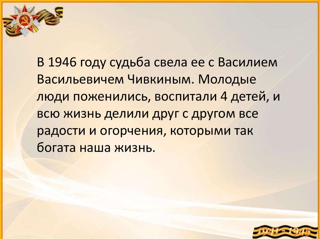 В 1946 году судьба свела ее с ВасилиемВасильевичем Чивкиным. Молодые