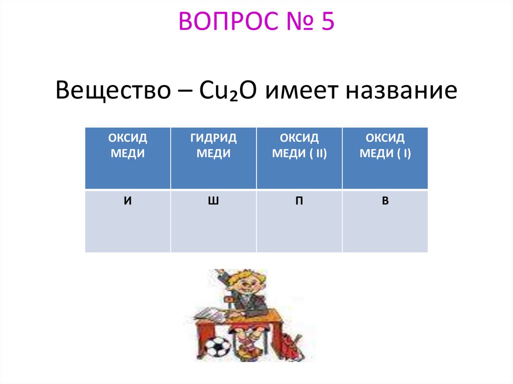 ВОПРОС № 5Веществo – Cu₂O имеет название