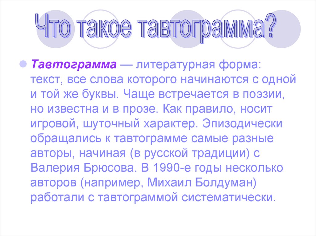 Тавтограмма — литературная форма:текст, все слова которого начинаются с одной