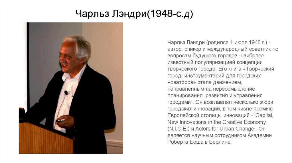 Чарльз Лэндри(1948-с.д)Чарльз Лэндри (родился 1 июля 1948 г.) автор, спикер и международный советник по