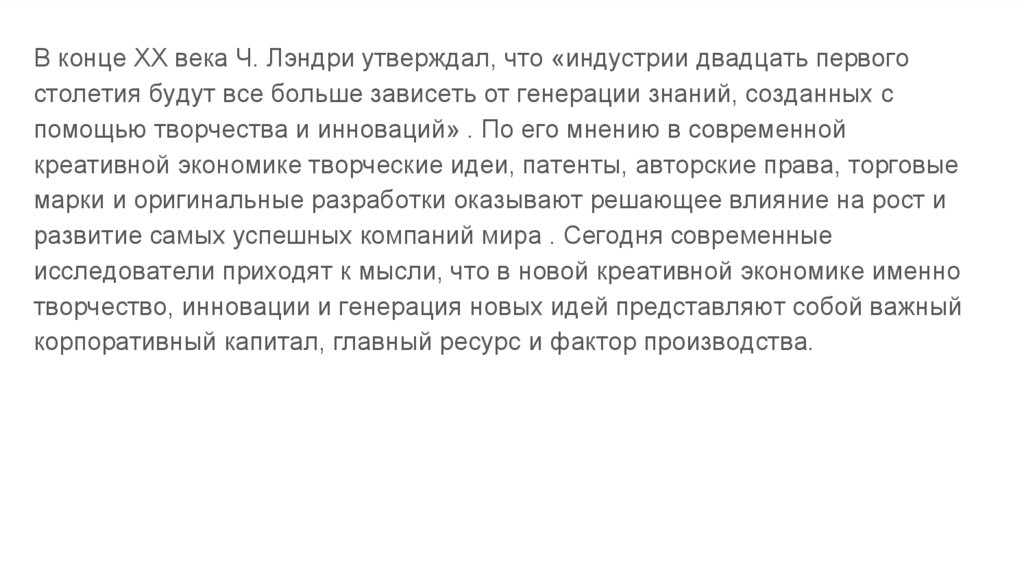 В конце ХХ века Ч. Лэндри утверждал, что «индустрии двадцать первогостолетия будут все больше зависеть от генерации знаний, созданных с