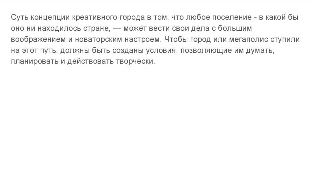 Суть концепции креативного города в том, что любое поселение - в какой быоно ни находилось стране, — может вести свои дела с большим