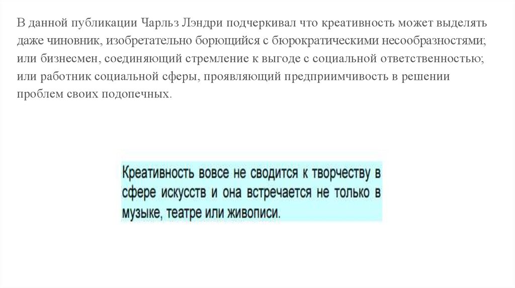 В данной публикации Чарльз Лэндри подчеркивал что креативность может выделятьдаже чиновник, изобретательно борющийся с бюрократическими несообразностями;