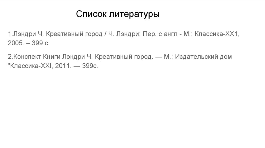 Список литературы1.Лэндри Ч. Креативный город / Ч. Лэндри; Пер. с англ - М.: Классика-ХХ1,