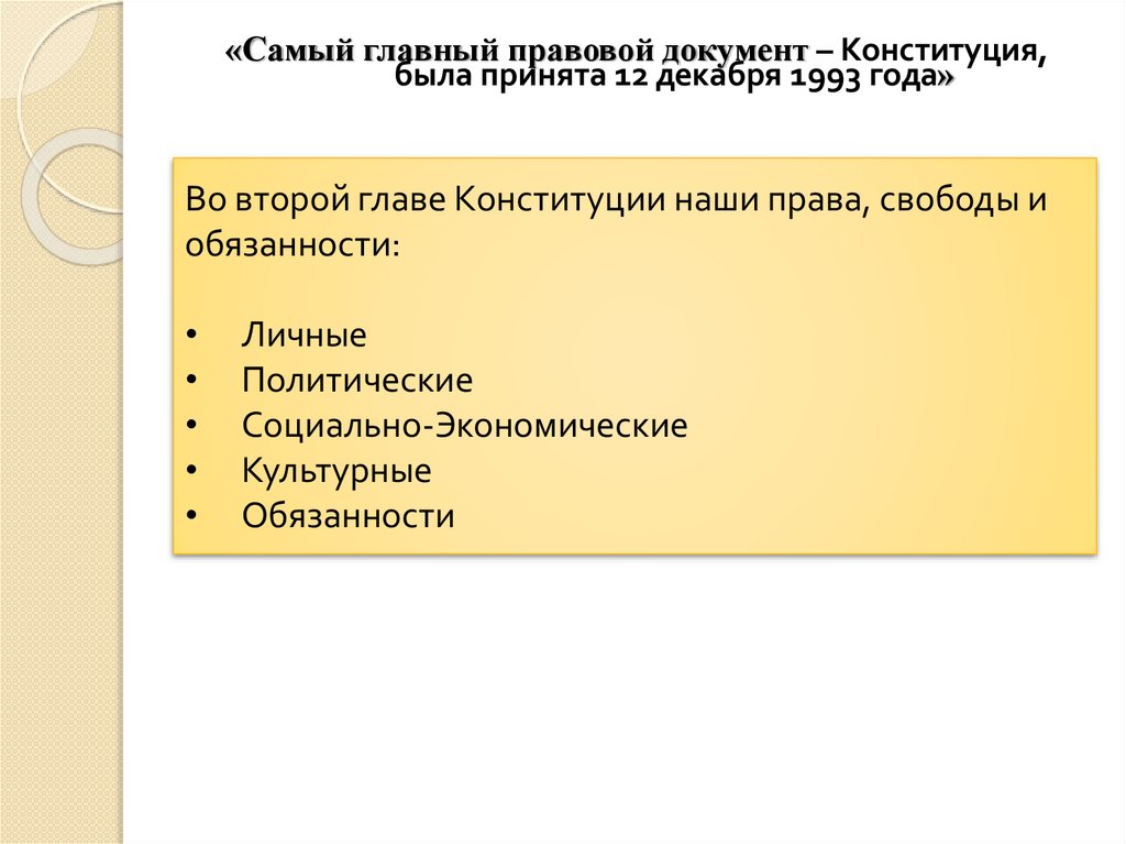 «Самый главный правовой документ – Конституция,была принята 12 декабря 1993 года»